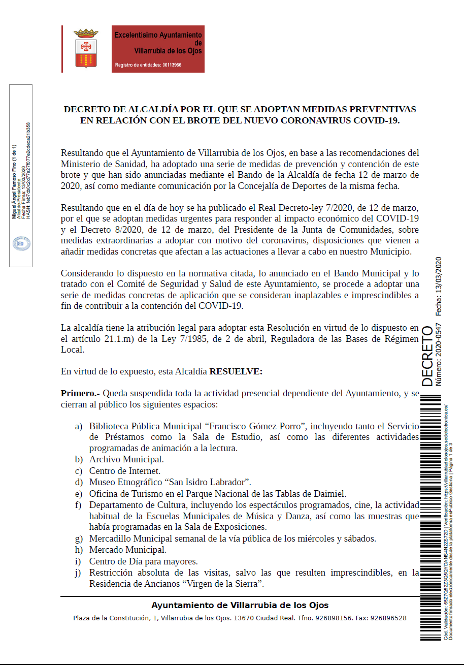 Villarrubia de los Ojos. Decreto de Alcaldía por el que se adoptan medidas preventivas en relación con el brote del nuevo Coronavirus COVID-19 Publicado en 14 marzo, 2020 por alcaldesapiedecalle en CIUDAD REAL, DESTACADOS, MUNICIPIOS, SOCIEDAD, Villarrubia de los Ojos // 0 Comentarios Comparte esto: Compartir en X (Se abre en una ventana nueva) X Comparte en Facebook (Se abre en una ventana nueva) Facebook Me gusta Cargando... Relacionado