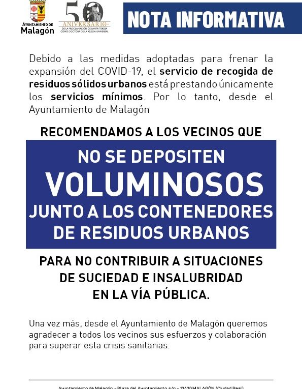 Debido a las medidas adoptadas para frenar la expansión del COVID-19, el servicio de recogida de residuos sólidos urbanos está prestando únicamente los servicios mínimos. Por lo tanto, desde el Ayuntamiento de Malagón recomendamos a los vecinos que no se depositen voluminosos junto a los contenedores de residuos urbanos para no contribuir a situaciones de suciedad e insalubridad en la vía pública.