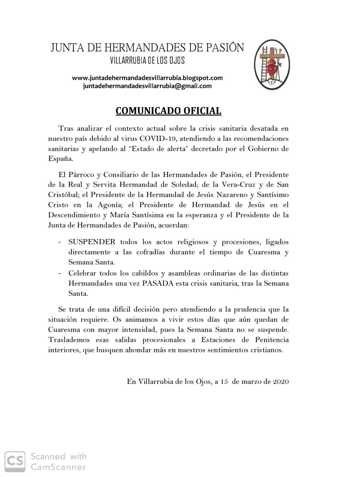 Villarrubia de los Ojos. Se suspenden los actos de nuestra Semana Santa, de Interés Turístico Regional, por el coronavirus Publicado en 20 marzo, 2020 por alcaldesapiedecalle en CIUDAD REAL, DESTACADOS, MUNICIPIOS, SOCIEDAD, Villarrubia de los Ojos // 0 Comentarios Descargar la información aquí Comparte esto: Compartir en X (Se abre en una ventana nueva) X Comparte en Facebook (Se abre en una ventana nueva) Facebook Me gusta Cargando... Relacionado