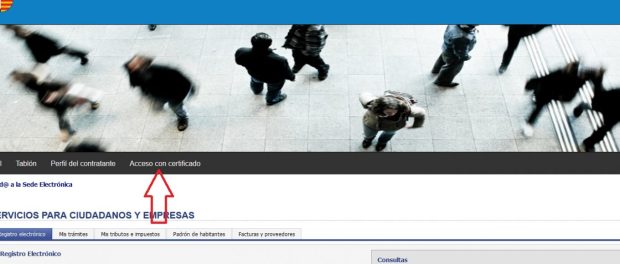3.- Abrir sesión, para lo cual se debe disponer de un Certificado Digital en vigor (en la siguiente imagen señalamos el enlace que se debe pulsar para acceder con el certificado digital).