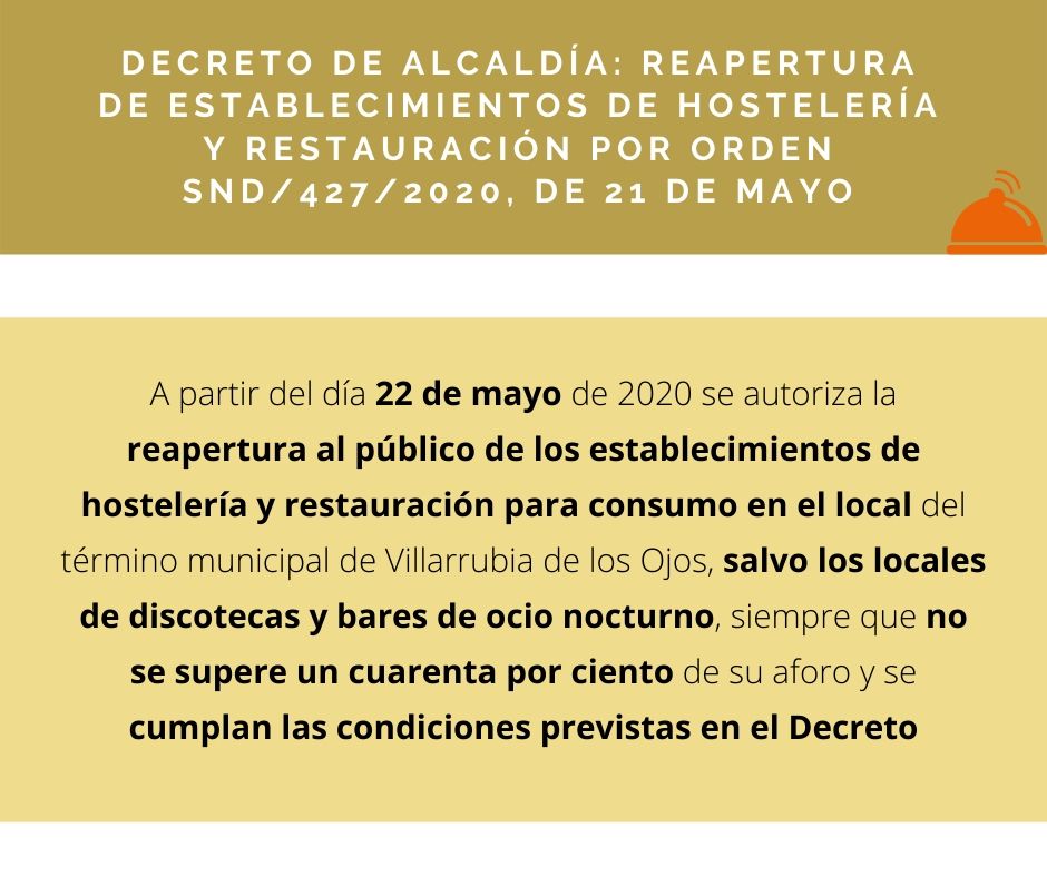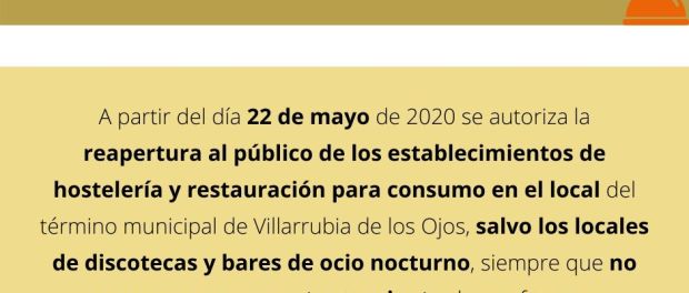 Villarrubia de los Ojos. Decreto de Alcadía: Reapertura de establecimientos de hostelería y restauración por Orden SND/427/2020, de 21 de mayo Publicado en 22 mayo, 2020 por alcaldesapiedecalle en CIUDAD REAL, DESTACADOS, MUNICIPIOS, SOCIEDAD, Villarrubia de los Ojos // 0 Comentarios Descargar el Bando aquí Comparte esto: Compartir en X (Se abre en una ventana nueva) X Comparte en Facebook (Se abre en una ventana nueva) Facebook Me gusta Cargando... Relacionado