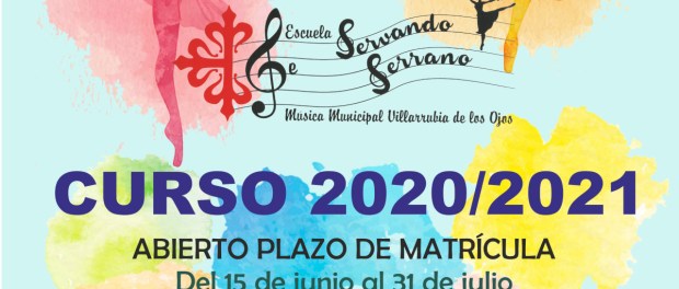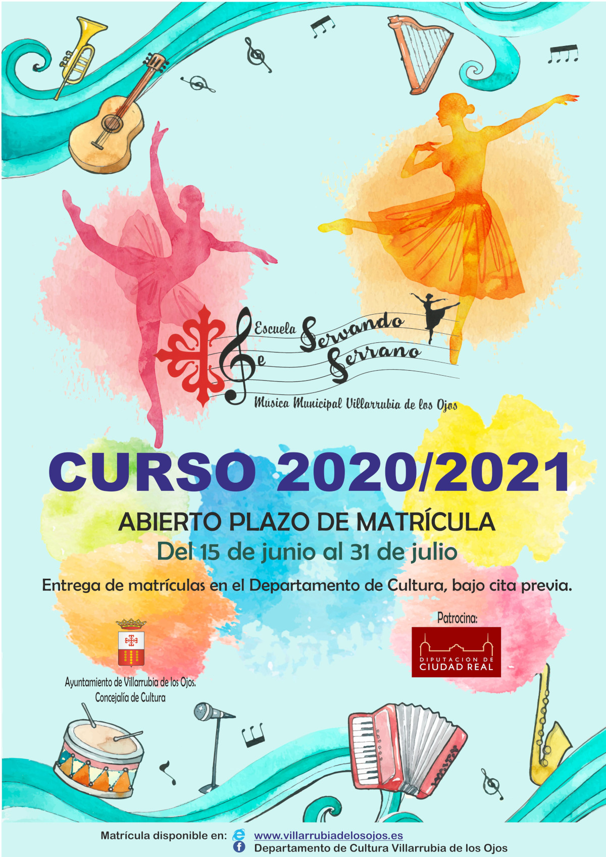 Villarrubia de los Ojos. Plazos de matriculación 2020/21 para la Escuela de Música Municipal Servando Serrano Publicado en 8 junio, 2020 por alcaldesapiedecalle en CIUDAD REAL, MUNICIPIOS, SOCIEDAD, Villarrubia de los Ojos // 0 Comentarios El plazo de matrícula sera del 15 de junio al 31 de julio. Descargar matricula para Danza aquí Descargar matricula para Música aquí Comparte esto: Compartir en X (Se abre en una ventana nueva) X Comparte en Facebook (Se abre en una ventana nueva) Facebook Me gusta Cargando... Relacionado