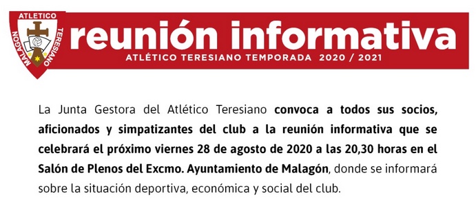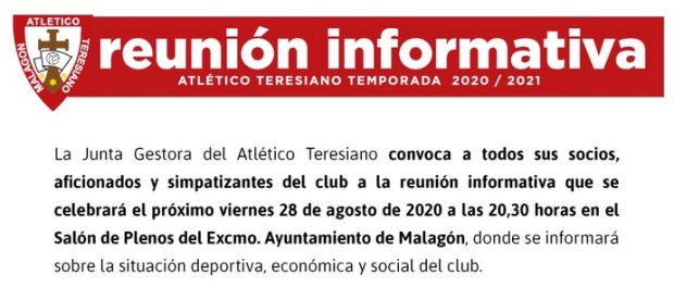 Malagón. La Nueva Junta Gestora del Atlético Teresiano convoca a todos los socios, aficionados y simpatizantes del club a una reunión informativa el próximo viernes 28 de agosto Publicado en 23 agosto, 2020 por alcaldesapiedecalle en CIUDAD REAL, DEPORTES, Malagón, MUNICIPIOS // 0 Comentarios Comparte esto: Compartir en X (Se abre en una ventana nueva) X Comparte en Facebook (Se abre en una ventana nueva) Facebook Me gusta Cargando... Relacionado