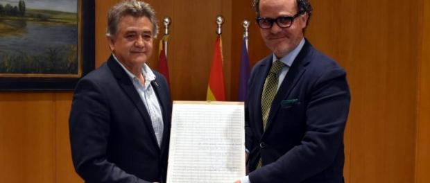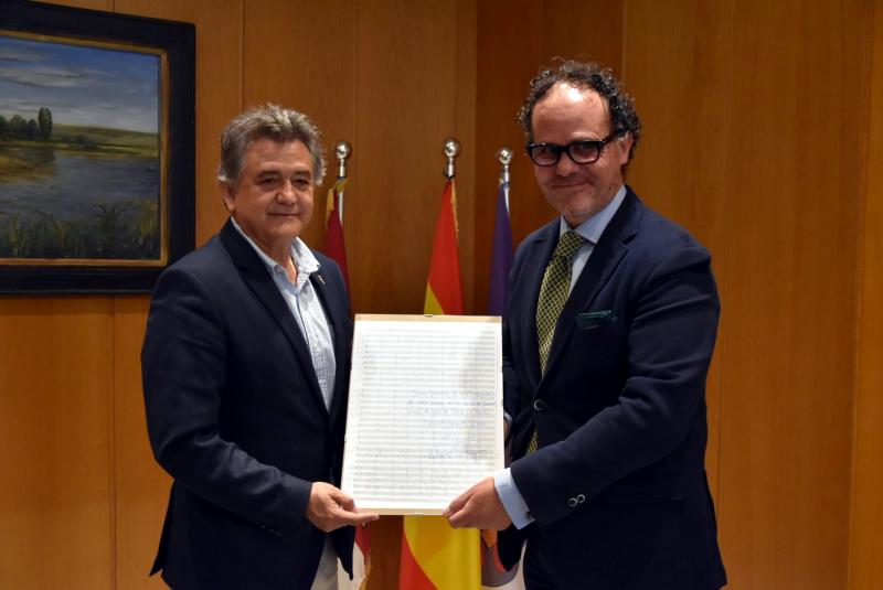 Daimiel Noticias.– El alcalde de Daimiel, Leopoldo Sierra, recibía este miércoles la donación de la cuarta hoja del manuscrito de la obra ‘Canto a Castilla-La Mancha’, del compositor José Zárate y Rodríguez de Gaspar.