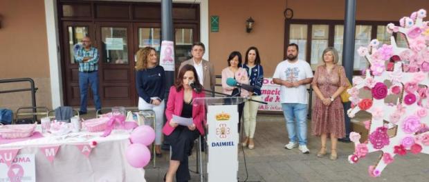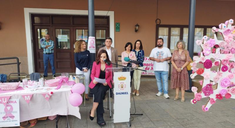 A las 11:30 horas se iniciaba el acto a las puertas del consistorio local con la intervención de Sonia Marchán, presidenta de la Asociación de Cáncer de Mama y Ginecológico de Castilla-La Mancha (AMUMA) quien reconocía como daimieleña que supone “un honor” estar en su municipio representando al colectivo de personas que padecen cáncer de mama. Agradeció el apoyo del Ayuntamiento, al alcalde, Leopoldo Sierra, y a la concejala de Servicios Sociales, Alicia Loro, así como el de voluntarias, la farmacia Olmedo (centro de recogida de flores en la localidad), medios de comunicación y daimieleños presentes.