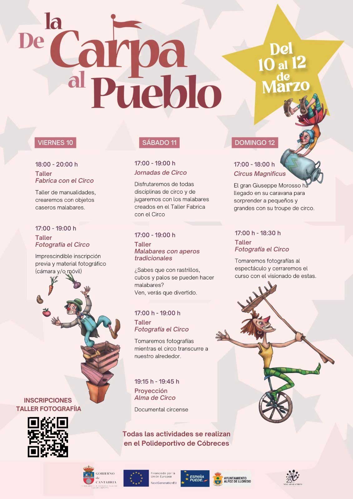 Con la propuesta «De la carpa al pueblo», Malabaracirco descubrirá a los asistentes sus habilidades circenses. Consistirá en varios talleres de manualidades, malabares, fotografía así como la visualización de un cortometraje y un espectáculo a cargo del gran Giuseppe Morosso que llegará a Cóbreces con su caravana para sorprender al público con las artes de su compañía.