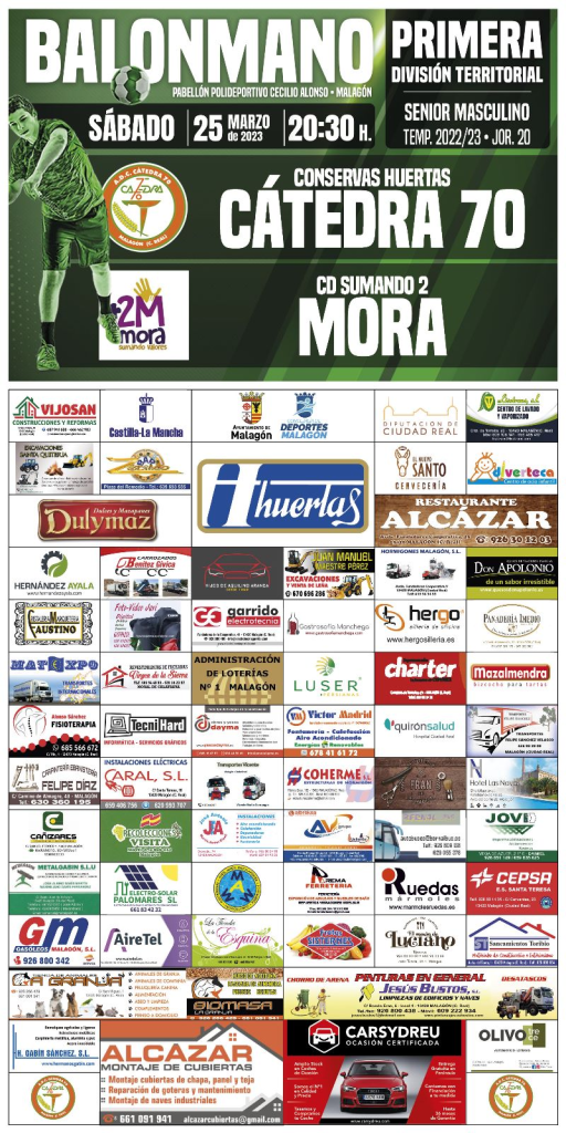 Malagón. Balonmano: Conservas Huertas Cátedra 70 – CD Sumando 2 Mora Publicado en 25 marzo, 2023 por alcaldesapiedecalle en CIUDAD REAL, DEPORTES, Malagón, MUNICIPIOS // 0 Comentarios Comparte esto: Compartir en X (Se abre en una ventana nueva) X Comparte en Facebook (Se abre en una ventana nueva) Facebook Me gusta Cargando... Relacionado