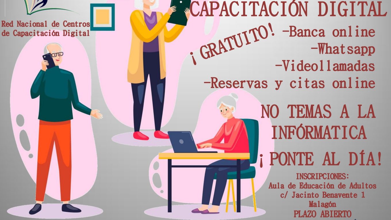 Malagón. Curso de Capacitación Digital Gratuito Publicado en 14 abril, 2023 por alcaldesapiedecalle en CIUDAD REAL, Malagón, MUNICIPIOS, SOCIEDAD // 0 Comentarios A partir del 26 de Abril dará comienzo un Curso de iniciación a la informática, totalmente gratuito, dirigido a personas que no tengan conocimientos informáticos. Se impartirá los miércoles y jueves de 18 h 30 a 20 h 30. Comparte esto: Compartir en X (Se abre en una ventana nueva) X Comparte en Facebook (Se abre en una ventana nueva) Facebook Me gusta Cargando... Relacionado