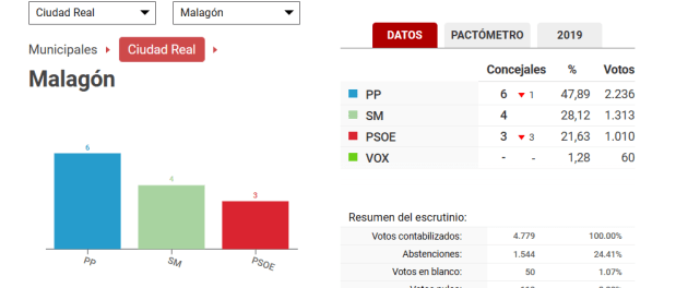 Malagón. RESULTADOS DE LAS ELECCIONES MUNICIPALES 2023 Publicado en 29 mayo, 2023 por alcaldesapiedecalle en CIUDAD REAL, Malagón, MUNICIPIOS, POLÍTICA // 0 Comentarios El Ayuntamiento de Malagón informa sobre el resultado electoral del día de ayer 28 de mayo de 2023 Comparte esto: Haz clic para compartir en X (Se abre en una ventana nueva) X Haz clic para compartir en Facebook (Se abre en una ventana nueva) Facebook Me gusta Cargando... Relacionado