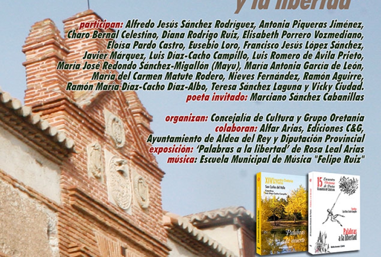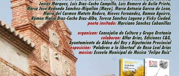El evento, enmarcado dentro de la programación cultural de verano, está organizado por el Ayuntamiento de Aldea del Rey y el Grupo Oretania, coordinado por el poeta solanero Luis Díaz-Cacho Campillo, contará con la poesía de Alfredo Jesús Sánchez Rodríguez, Antonia Piqueras Jiménez, Charo Bernal Celestino, Diana Rodrigo Ruiz, Elisabeth Porrero Vozmediano, Eloísa Pardo Castro, Eusebio Loro, Francisco Jesús López Sánchez, Javier Márquez, Luis Díaz-Cacho Campillo, Luis Romero de Ávila Prieto, María José Redondo Sánchez-Migallón (Mayu), María Antonia García de León, María del Carmen Matute Rodero, Nieves Fernández, Ramón Aguirre, Ramón María Díaz-Cacho Díaz-Albo, Teresa Sánchez Laguna, Vicky Ciudad y como poeta invitado a Marciano Sánchez Cabanillas.