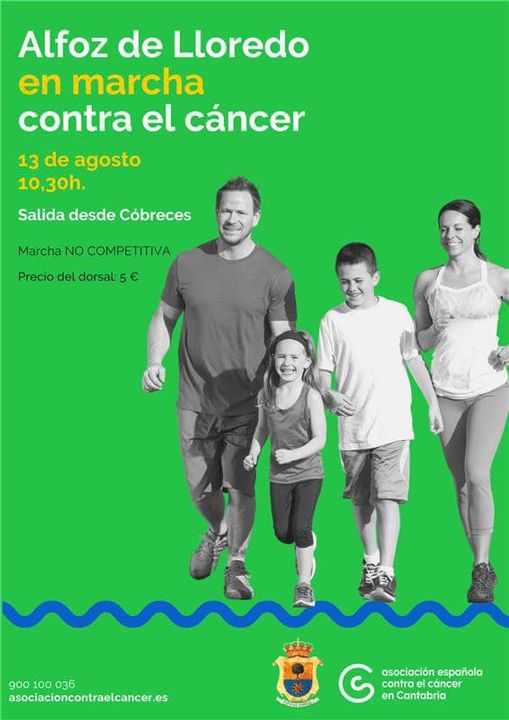 Alfoz de Lloredo celebrará el domingo, 13 de agosto, su Marcha contra el Cáncer, organizada por la Asociación Española contra el Cáncer en Cantabria. Se trata de una marcha no competitiva que, esta vez, tendrá su salida en Cóbreces, después de que en ediciones anteriores haya tenido lugar en otros pueblos del municipio. Será a las 10.30 horas y llegará al mismo punto después de recorrer 5 kilómetros. A la llegada, habrá una máster class de zumba a cargo de Nieves Rebanal y sorteo de regalos con la numeración de los dorsales.