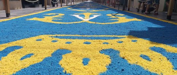 El Ayuntamiento de Daimiel, a través de la delegación de Festejos, coordinó el operativo que ha permitido la citada elaboración en la que han participado en torno a unos 40 voluntarios, entre los que se encontraba la concejal Alicia Loro, ejecutando el diseño del centro de mayores basado en ‘Símbolos marianos’ con la corona de reina, la M de madre, en tonos amarillos y azules, y la flor de lis, como explicó una de sus impulsoras, Mari Carmen Torija.