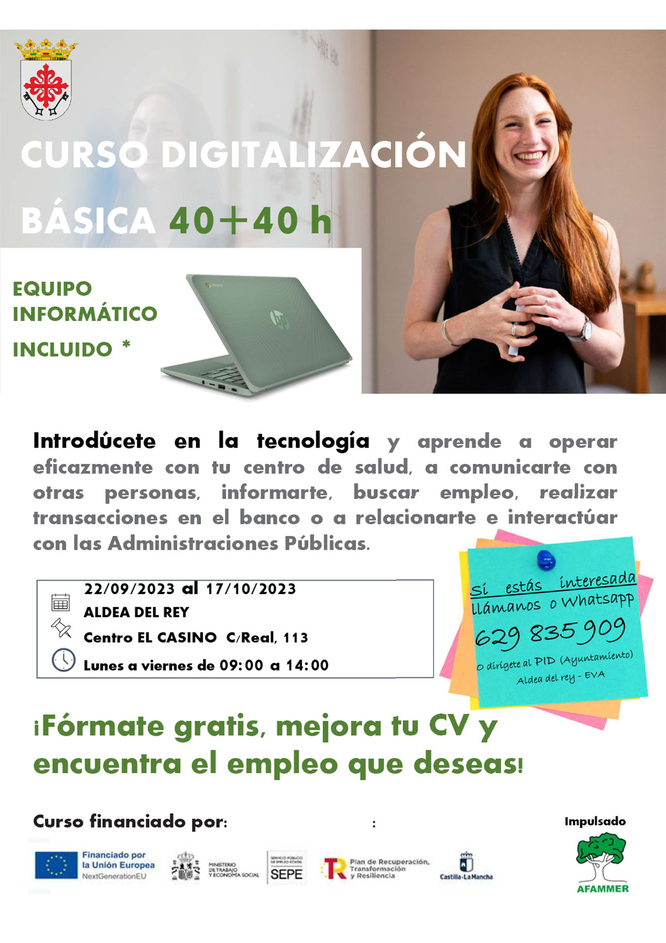 El Ayuntamiento de Aldea del Rey a través de la concejalía de Igualdad de Género, María Josefa Alañón Utrilla y de la concejalía de Educación, Araceli Valbuena Cofrade, han impulsado la puesta en marcha, para este mes de septiembre, de una selección de cursos gratuitos especializados en digitalización y dirigidos principalmente a mujeres desempleadas del municipio, con el objetivo de mejorar sus posibilidades de inserción en el mercado laboral.