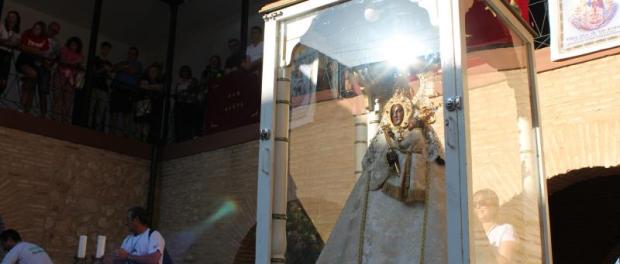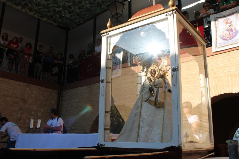 Daimiel Noticias.- Esta mañana al alba los mozos y mozas de Daimiel sacaban a la Virgen de las Cruces de la Ermita del Cristo para ser trasladada a su residencia en el Santuario de las Cruces. La tradicional marcha que desplaza a hombros a la patrona de Daimiel ha estado formada por 10 relevos de 4 personas. Cientos más de acompañantes, al trote, en bicicleta o andando; han recorrido todo el trayecto como muestra de devoción. El itinerario, con 6 descansos, culminaba su ruta en torno a las 09:00 horas en el descanso de la familia Márquez Reguillos, que lucía recién remodelado. De este modo, multitud de daimieleños y daimieleñas recibían a ‘la morenita’ para ir junto a ella en procesión hasta el patio principal del santuario. Entre los asistentes, el alcalde, Leopoldo Sierra, y demás miembros del ejecutivo local. Así comenzaba la romería de septiembre.