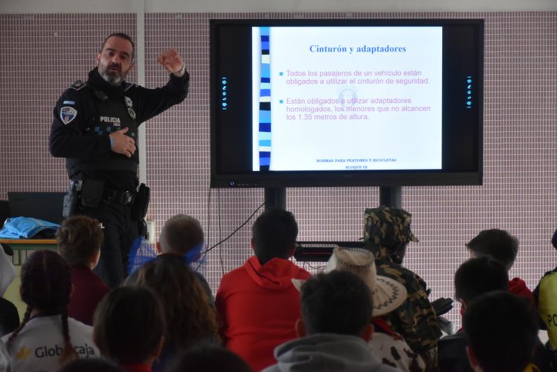 Durante el transcurso de la iniciativa en la que han proyectado diferentes diapositivas con ejemplos de seguridad vial, también han conocido el equipamiento de los policías y se han probado incluso, los chalecos antibalas, guantes o grilletes. Una experiencia que han acogido con mucho entusiasmo y que ha coincidido con los disfraces de carnaval que hoy han llevado al colegio.