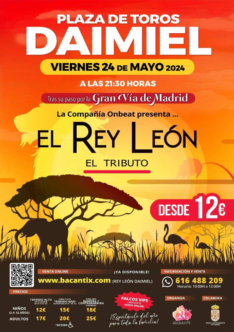 Daimiel Noticias. – Continúan a la venta las entradas para el tributo de ‘El Rey León’ en Daimiel. El espectáculo dirigido a público familiar se celebrará mañana viernes 24 de mayo en la Plaza de Toros a partir de las 21:30 horas.
