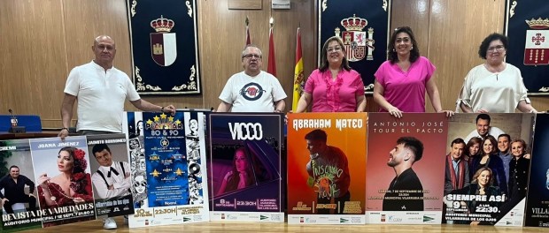 La alcaldesa de Villarrubia de los Ojos, Encarnación Medina, y la concejal de Festejos, Rosa Redondo, junto a otros miembros del equipo de gobierno municipal, presentaron este fin de semana los conciertos principales de la próxima Feria en el salón de plenos del Ayuntamiento, conciertos que comenzarán la mayoría a las 23.30 horas, salvo el de “Siempre Así”, el Tributo a Mickael Jackson, Play Star y la revista de Variedades que comenzarán antes, en el Auditorio Municipal.