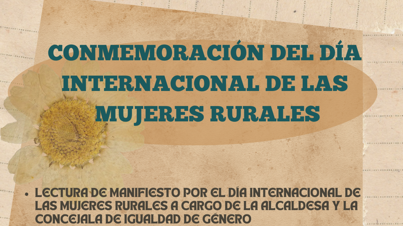 Este mismo 16 de octubre, en el Salón de Plenos del Ayuntamiento, a partir de las 17.30 horas se celebrará el Acto Institucional con motivo del Día Internacional, que comenzará con la lectura de Manifiesto por el Día Internacional de las Mujeres Rurales por parte de la alcaldesa Encarnación Medina y la concejala de Igualdad de Género, Sonia Ruiz.