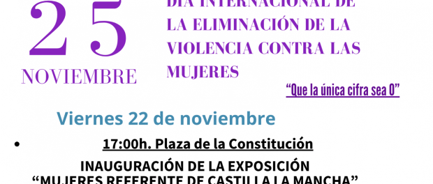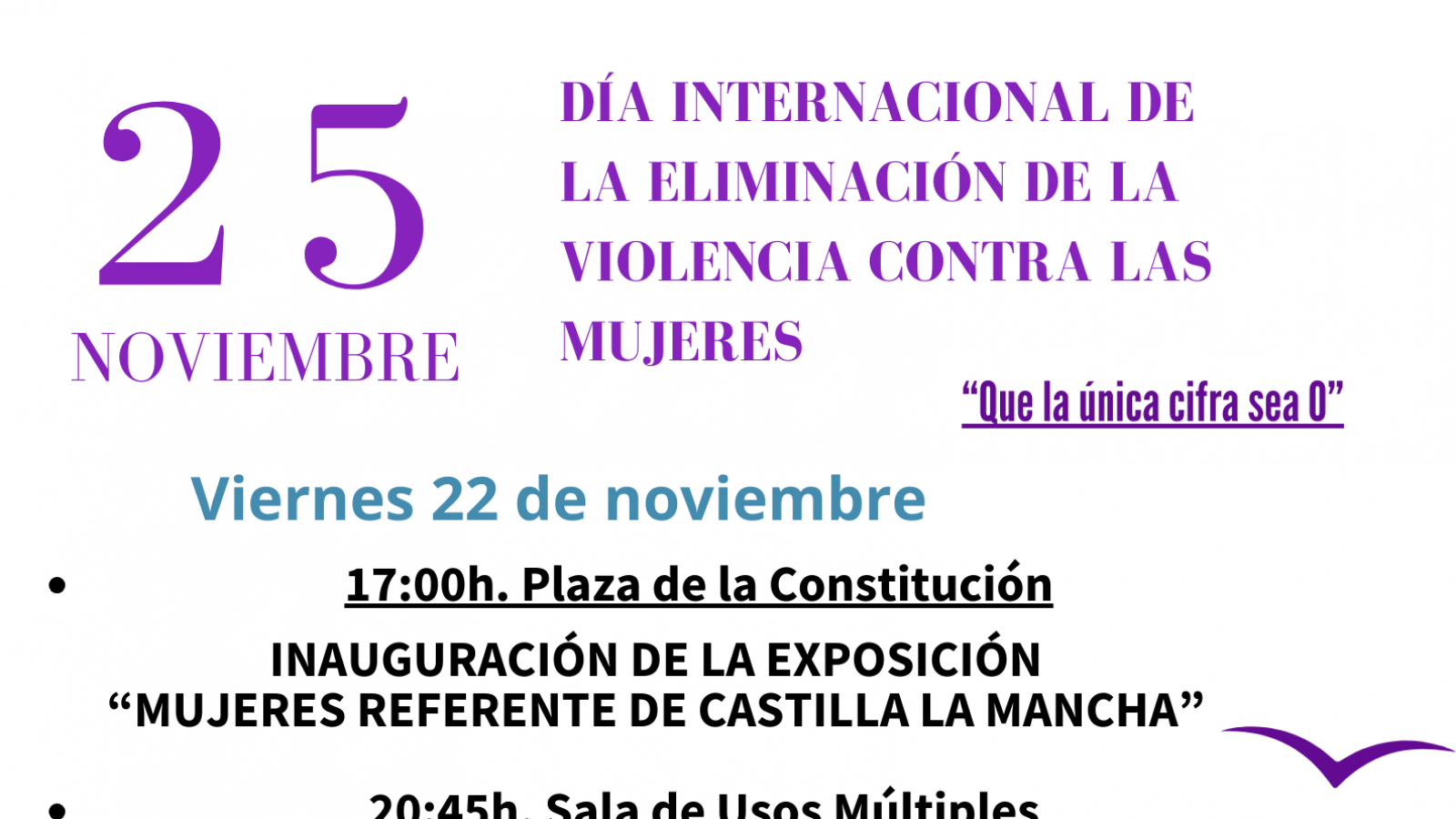 El Ayuntamiento de Villarrubia de los Ojos (Ciudad Real),a través de su Concejalía de Igualdad, y el Centro de la Mujer, han programado una serie de actividades del 22 al 25 de noviembre, con motivo del Día Internacional de la Eliminación de la Violencia contra las Mujeres, y que consistirán en charlas, teatro, exposición, entre otros actos, con el lema “que la única cifra sea 0”.