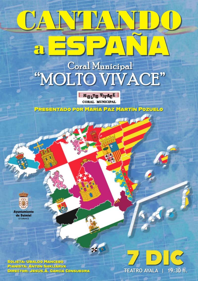 Daimiel Noticias. – La Coral Municipal ‘Molto Vivace’ llevará a cabo un concierto el próximo 7 de diciembre a las 19:30 horas en el teatro Ayala con el nombre ‘Cantando a España’. En palabras de María Dolores González-Mohíno, presidenta de la coral, esta actuación se ha preparado con dedicación desde el comienzo del curso en el verano, con la intención de ofrecer una propuesta diferente a las presentadas anteriormente. “Queríamos enfrentarnos una vez más al público, no desde la parroquia como siempre es nuestra costumbre, sino desde el teatro Ayala, con un repertorio profano”, comentó.