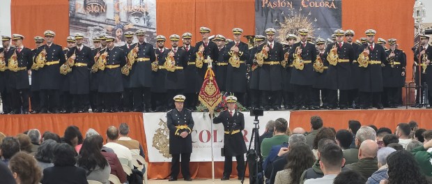 Los siguientes en subir al escenario han sido los daimieleños, que han presentado un repertorio caracterizado por marchas propias, una seña de identidad que refleja el crecimiento de la formación y que también le ha reportado el prestigio del que goza. Precisamente, Juan Carlos Martín-Consuegra, director musical, ha puesto en valor el esfuerzo de la agrupación por mantener alto el nivel y la aportación de un estilo propio que, dijo, “es lo que mejor nos define”, al tiempo que trasladó el orgullo que supone compartir escenario con bandas que son todo un referente a nivel nacional. En total, han sido seis las marchas interpretadas por ‘Los Coloraos’, todas compuestas por Martín-Consuegra: ‘La flagelación’, ‘Amor despojado’, ‘Lanzada’, ‘La sentencia’, ‘La crucifixión’ y ‘El compás de las aguas’.