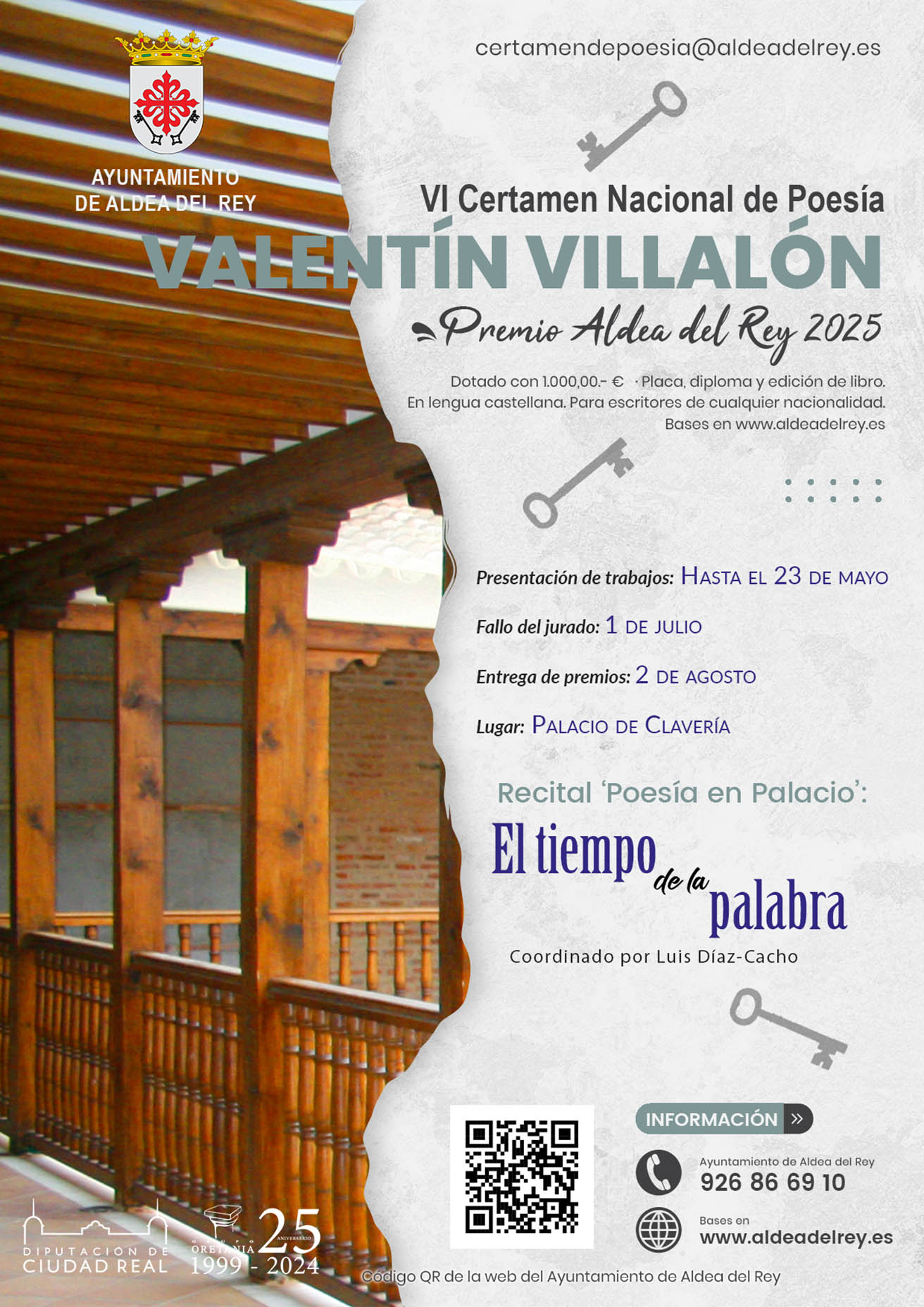 El plazo de admisión de los trabajos para el Certamen Nacional de Poesía ‘Valentín Villalón. Premio Aldea del Rey 2025’, terminará el 23 de mayo de 2025 a las 23:59, hora local. El fallo del jurado se hará público a partir del día 1 de julio de 2025 y la entrega de premios tendrá lugar el 2 de agosto de 2025, en el Palacio de Clavería de Aldea del Rey, durante la celebración del recital poético ‘Poesía en el Palacio’, en la que tendrá lugar la lectura de poemas del XVII Encuentro Oretania de Poetas ‘El tiempo de la palabra’.