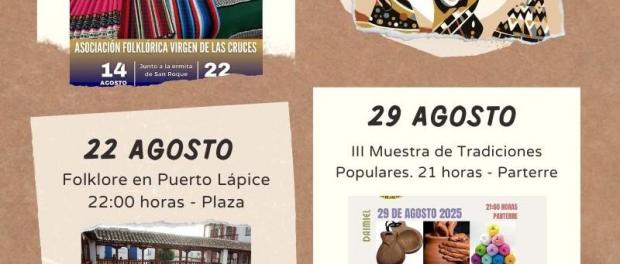 El primer evento tendrá lugar el 14 de agosto, con la participación en el XXIV Festival de bailes regionales en honor a San Roque durante las fiestas del conocido barrio daimieleño. Esta cita tradicional se celebrará junto a la ermita de San Roque, a partir de las 22:00 horas.