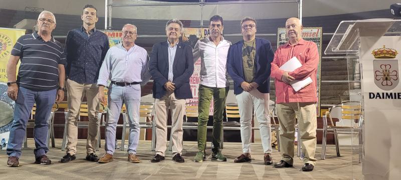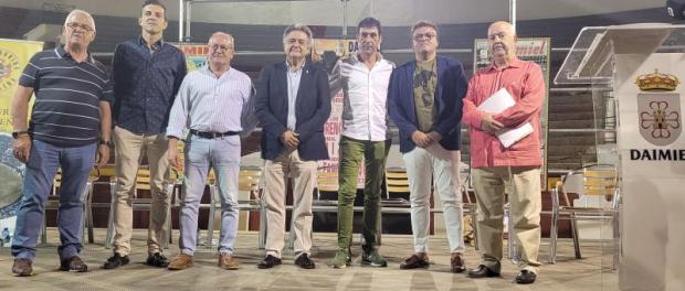 El pregonero estuvo acompañado en el escenario por el alcalde de Daimiel, Leopoldo Sierra, el presidente de la Peña Taurina Daimieleña, Javier Romero, el secretario de la organización, Paco Córdoba, los diestros Antonio Linares y Luis Miguel Vázquez, y el presentador del pregonero, Javier Núñez.