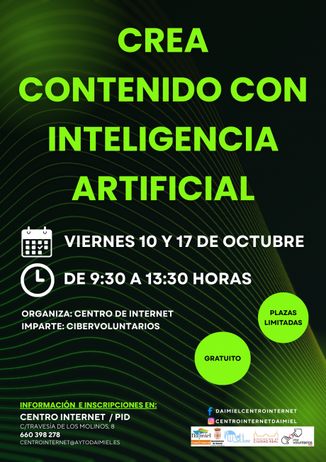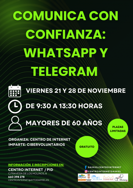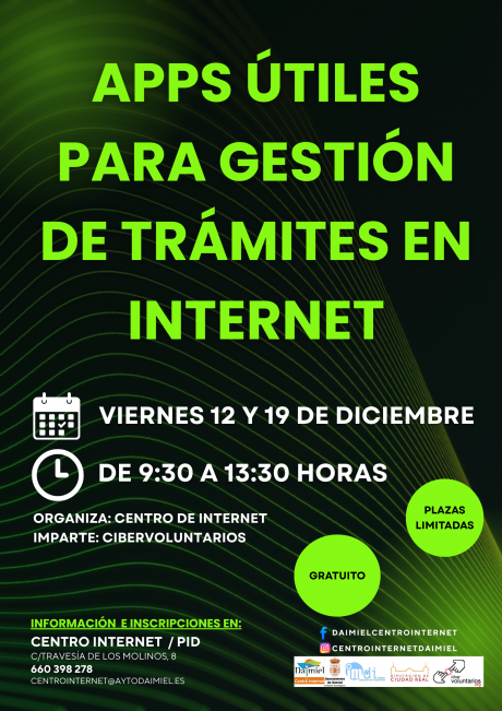 Las inscripciones en los talleres se ha puesto en marcha este lunes 22 de septiembre. Se pueden realizar de forma presencial en el Centro de Internet ubicado en el Centro Motilla (C/Travesía de los Molinos, 8), por teléfono en el 660 398 278 o por correo electrónico a centrointernet@aytodaimiel.es. Las plazas serán asignadas por riguroso orden de inscripción y las actividades darán comienzo el miércoles 1 de octubre.