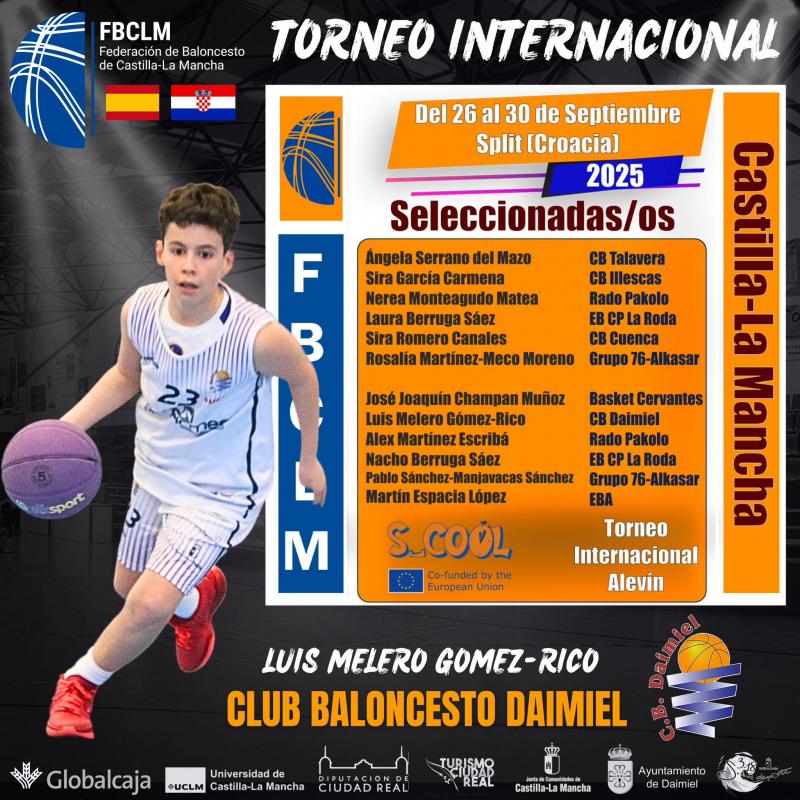 Daimiel Noticias.– Luis Melero Gómez-Rico, jugador alevín de la cantera del Club Baloncesto Daimiel, ha sido convocado por la Federación Regional de Baloncesto de Castilla-La Mancha (FBCLM) para formar parte de la selección masculina y mixta que disputará un torneo internacional en Split (Croacia), desde el próximo viernes 26 hasta el martes 30 de setiembre.