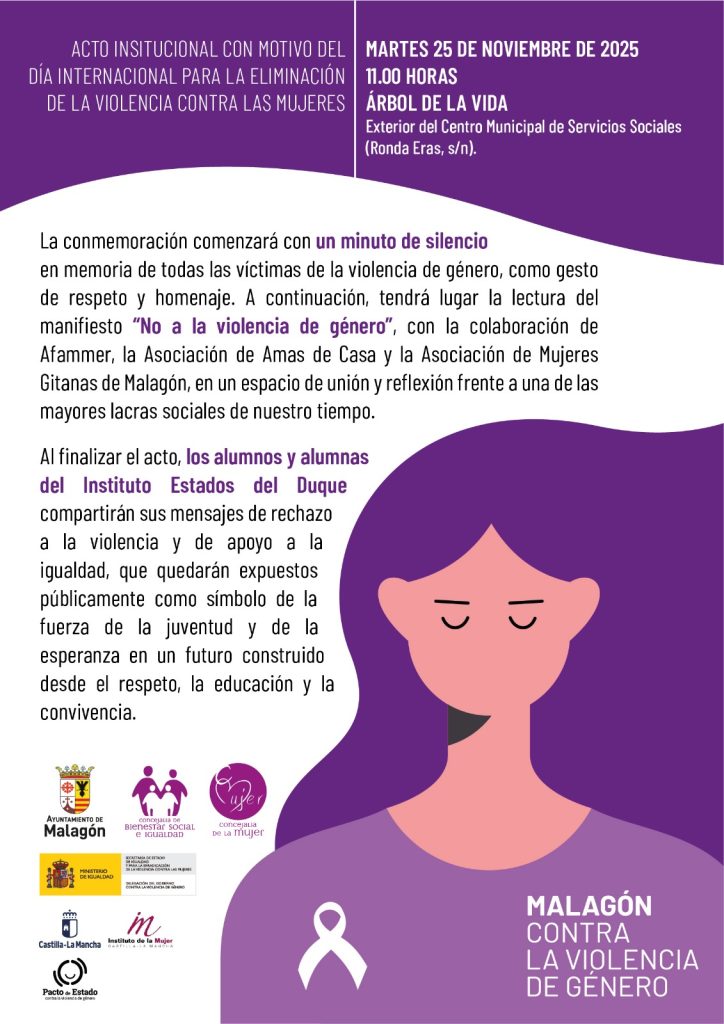 El próximo martes 25 de noviembre de 2025, Malagón conmemorará el Día Internacional para la Eliminación de la Violencia contra las Mujeres con un acto especial junto al Árbol de la Vida, en el exterior del Centro Municipal de Servicios Sociales, situado en la Calle Ronda Eras.