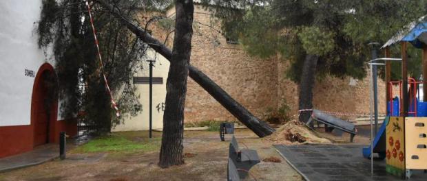 Por motivos de seguridad, siguen precintados varios juegos infantiles situados junto a grandes árboles, como los del Parterre y el parque del Carmen. En este último, un pino cercano ha levantado un banco y, al caer sobre la grada de sombra de la Plaza de Toros, ha derribado una farola y ha causado daños en la parte superior del muro.