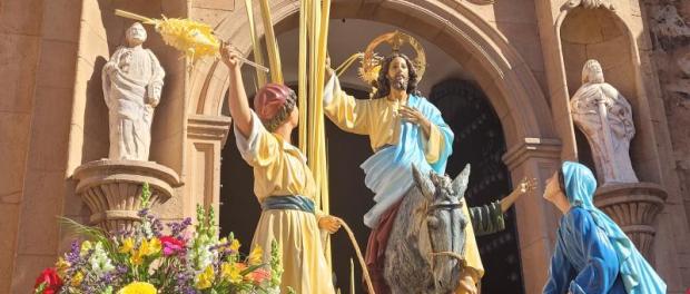 Palmas y ramos de olivo acompañaron al paso en un recorrido que, como novedad, finalizó en la parroquia de Santa María, recuperando una estampa muy significativa para los daimieleños. A pesar del viento y del descenso de las temperaturas, numerosos vecinos salieron a la calle para acompañar una procesión que volvió a contar con el acompañamiento musical de la Banda Municipal de Música y la Banda de Tambores y Cornetas de ‘Los Coloraos’.
