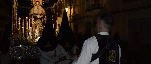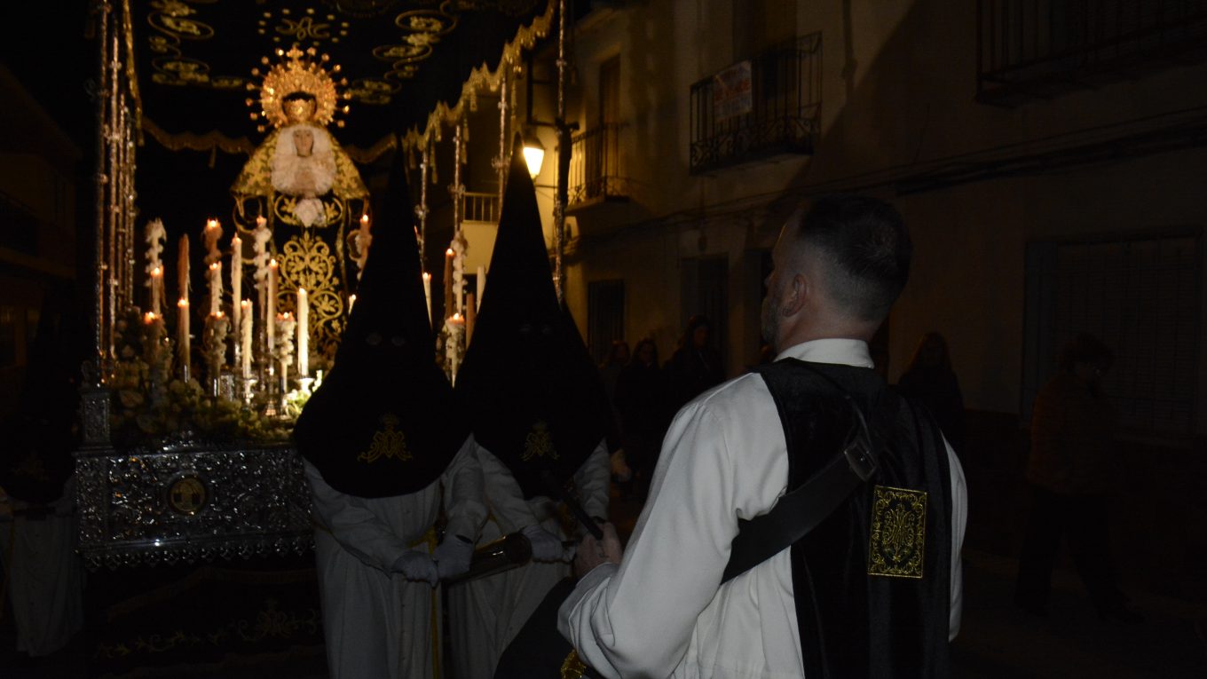 La procesión hizo verdadero honor a su nombre: La Soledad. Solo el constante y emotivo sonido del tambor, a cargo de David Poveda, rompía el silencio, acompañando el paso pausado de la Hermandad en su tercera salida del Viernes Santo.
