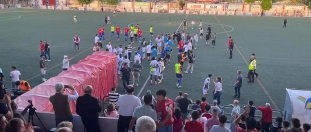 Así terminó el partido en el Delgado Meco en el derbi provincial que enfrentó a los de Tato con el Sporting de Alcázar. Un único gol en el minuto 46 les valía a los alcazareños para quedarse con los tres puntos. La otra cara del partido estuvo protagonizada por dos interrupciones, el inicio del protocolo antirracismo y la suspensión del partido a falta de 5 minutos del descuento por el lanzamiento de un objeto al campo. Un partido muy tenso dentro y fuera del verde que terminó reanudándose y concluyó con la incursión en el campo de ambas aficiones y una tangana final.