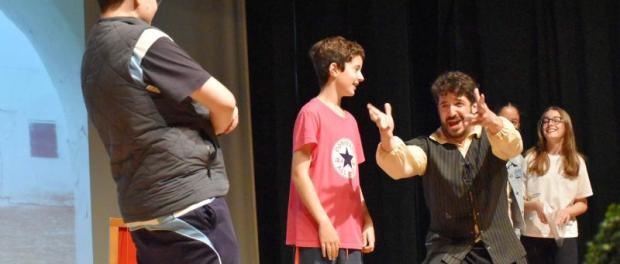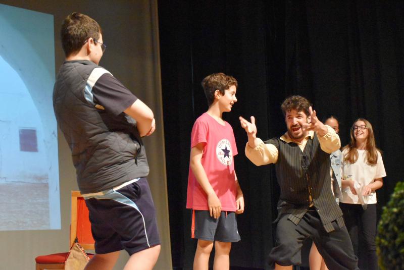 Encarnó al propio Cervantes y, a caballo entre la platea y el escenario, llevó a los alumnos por las dependencias de la venta daimieleña para acabar recreando, con la ayuda de varias de ellos, el pasaje donde fue armado caballero. Uno de los episodios más conocidos de El Quijote y que Cervantes pudo escribir inspirándose en la Venta de Borondo. Ya en pie, dio vida a las aventuras del ingenioso hidalgo y de su inseparable escudero Sancho Panza. Tras esta recreación y la de la lucha contra los molinos de viento, un atril con un ejemplar de El Quijote ocupó el centro del escenario.
